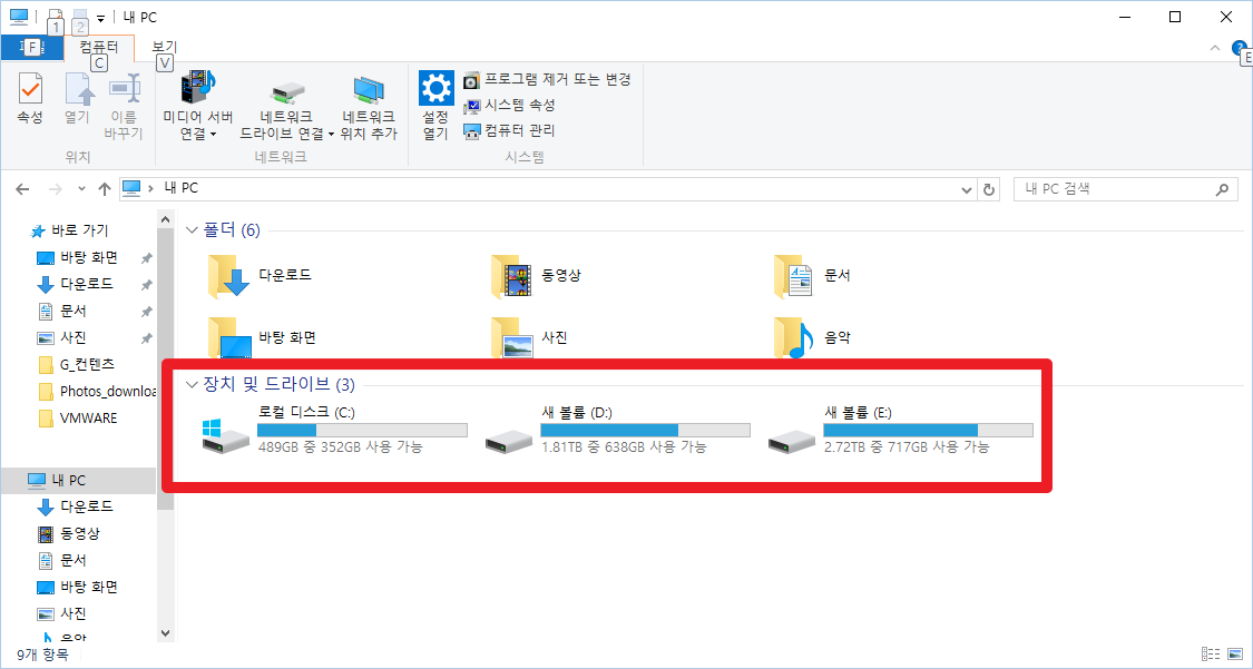 윈도우 설치를 완료하고 기존에 사용하던 하드 디스크를 다시 연결하였는데 사용하던 하드 디스크들이 정상적으로 인식이 되지 않는 현상이 생기더군요.