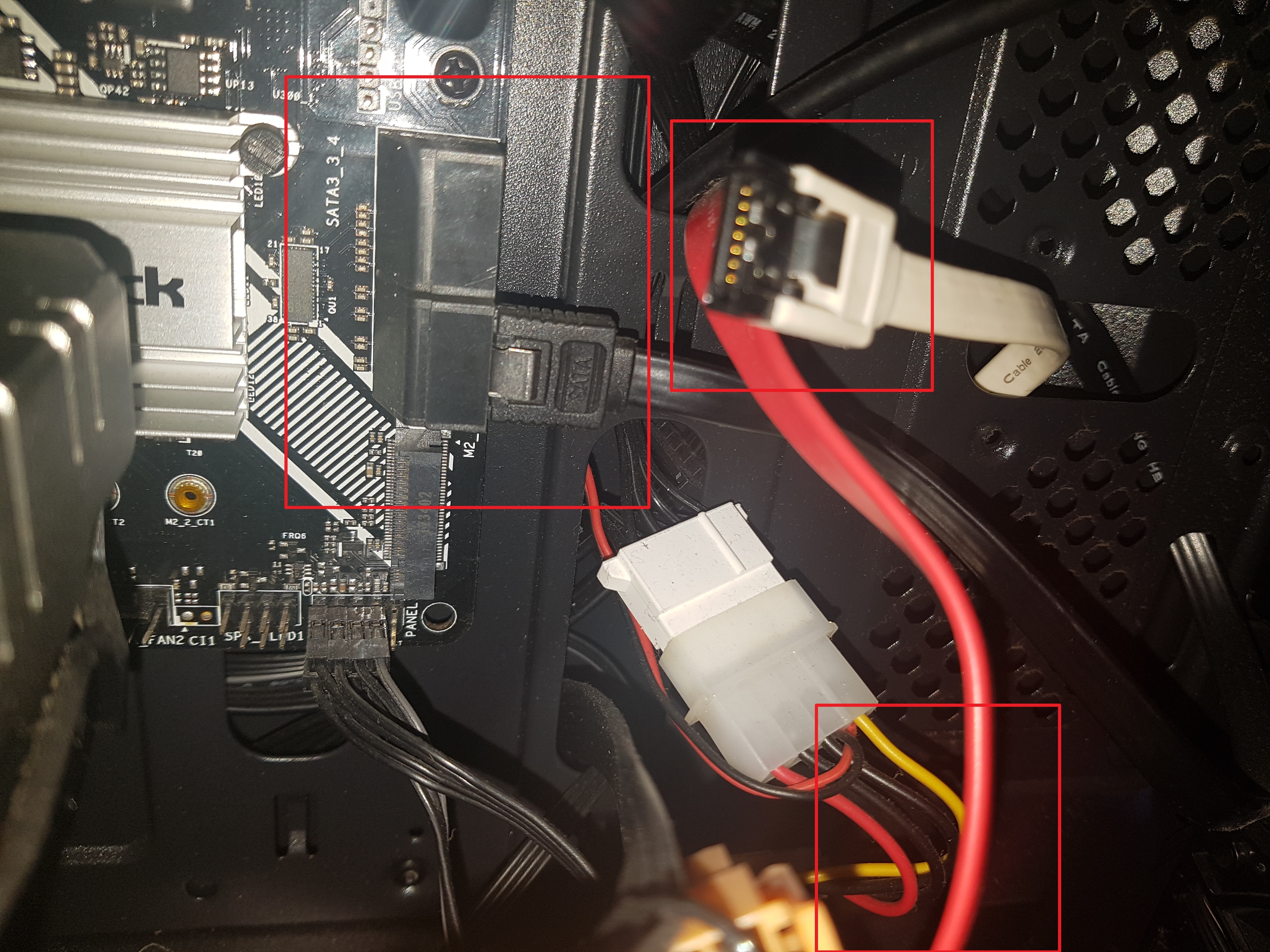 가장 큰 빨간색 네모 칸이 메인보드와 SATA 케이블이 연결되는 자리였습니다. 총 3개의 케이블이 연결되어 있었으며 SSD만 남겨 놓고 기존에 연결되어 있던 하드와 연결된 SATA 케이블은 모두 제거하였습니다.
