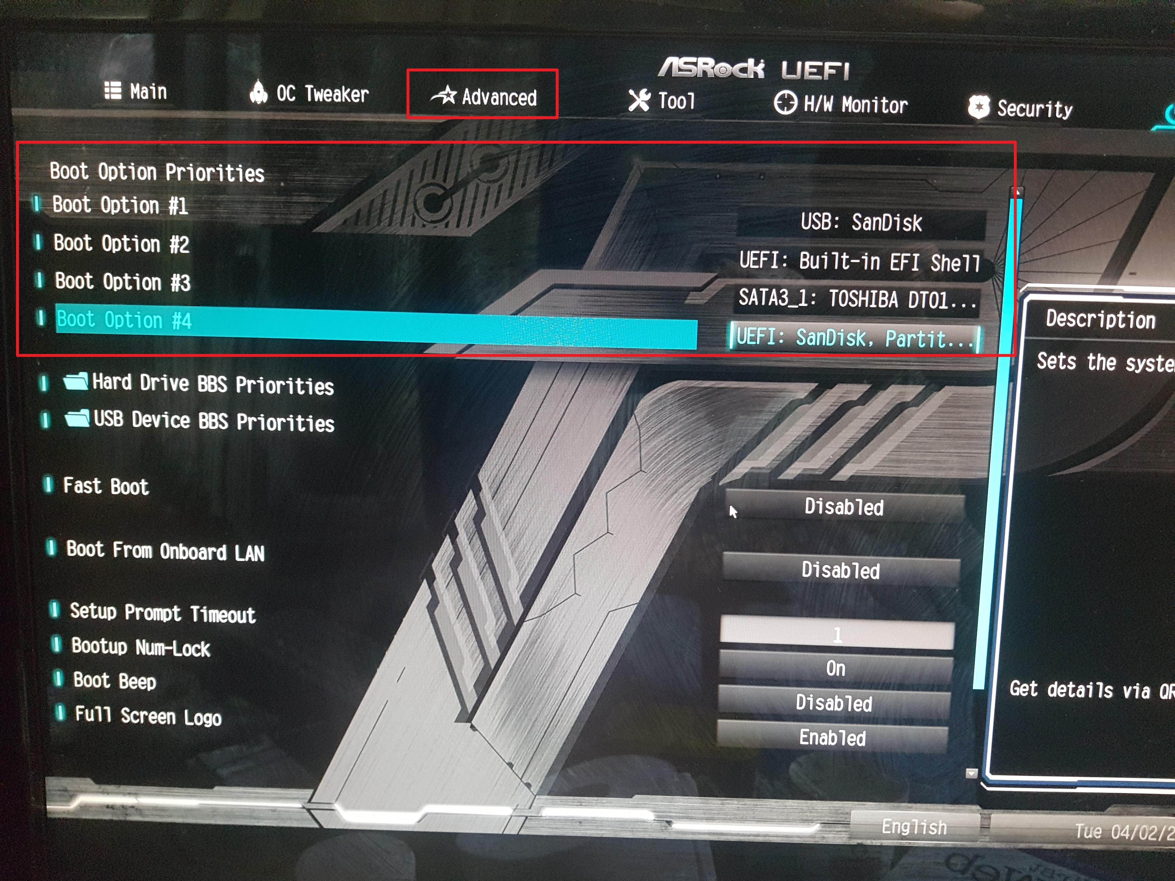 Advanced 메뉴를 확인해 보니 Boot Option에서 SSD가 가장 첫 번째로 세팅이 되어 있었습니다.