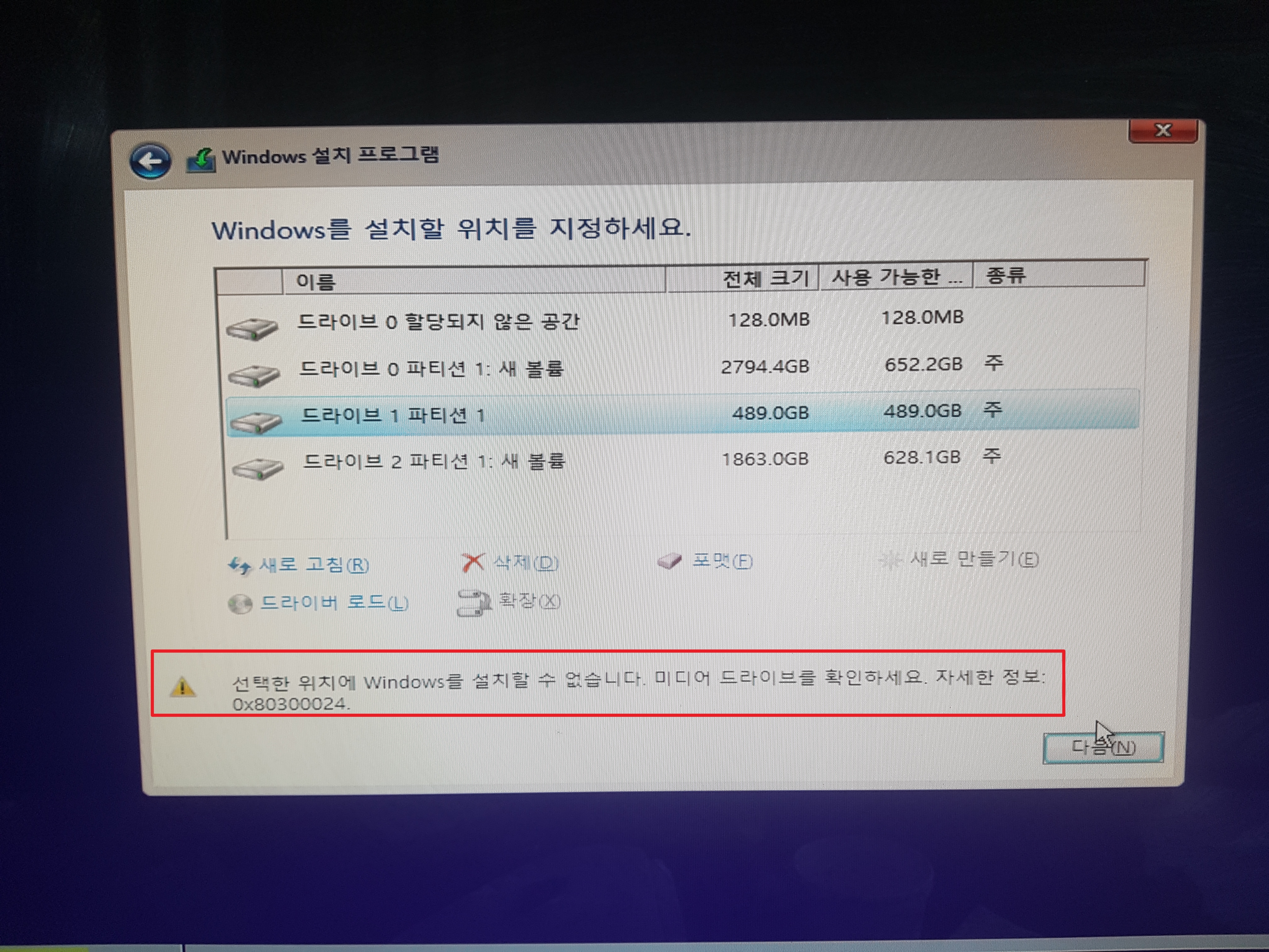 오랜만에 컴퓨터를 포맷했습니다. 별문제 없이 금방 끝날 것으로 생각되었는데 윈도우를 설치하려고 보니 선택한 위치에 Windows를 설치할 수 없습니다. 미디어 드라이브를 확인하세요. 자세한 정보 0x80300024라는 오류가 나오면서 윈도우 설치가 진행이 안 되더군요.