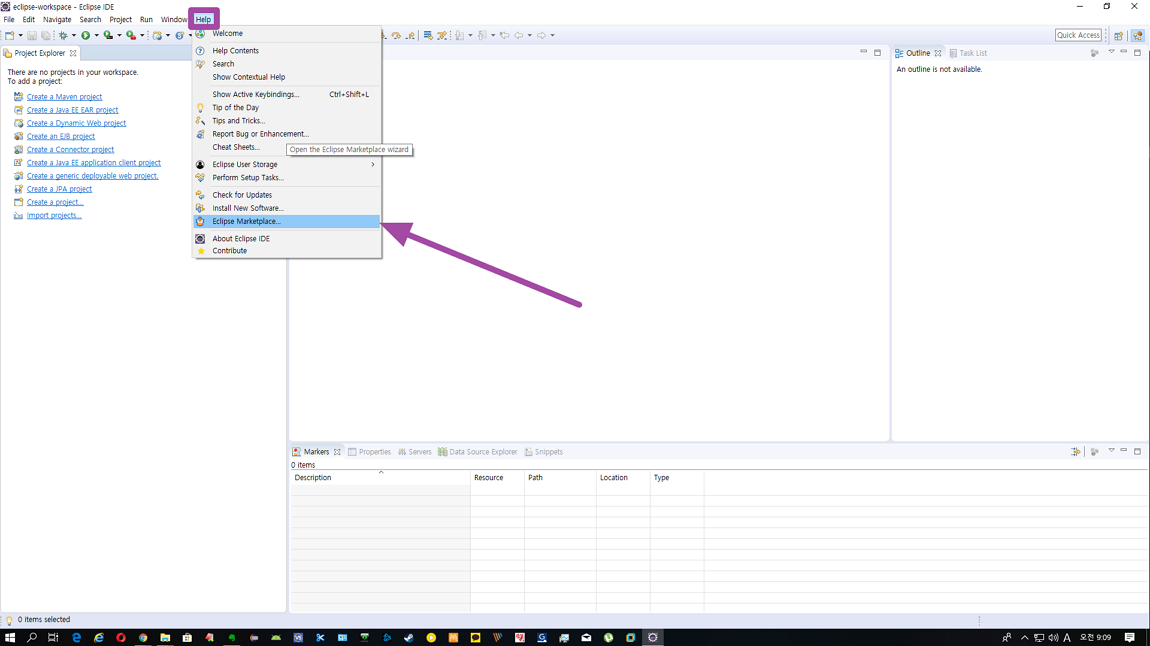 이클립스를 다운받고 상단에 Help 메뉴에 Eclipse Marketplace 메뉴를 눌러 보도록 하겠습니다.