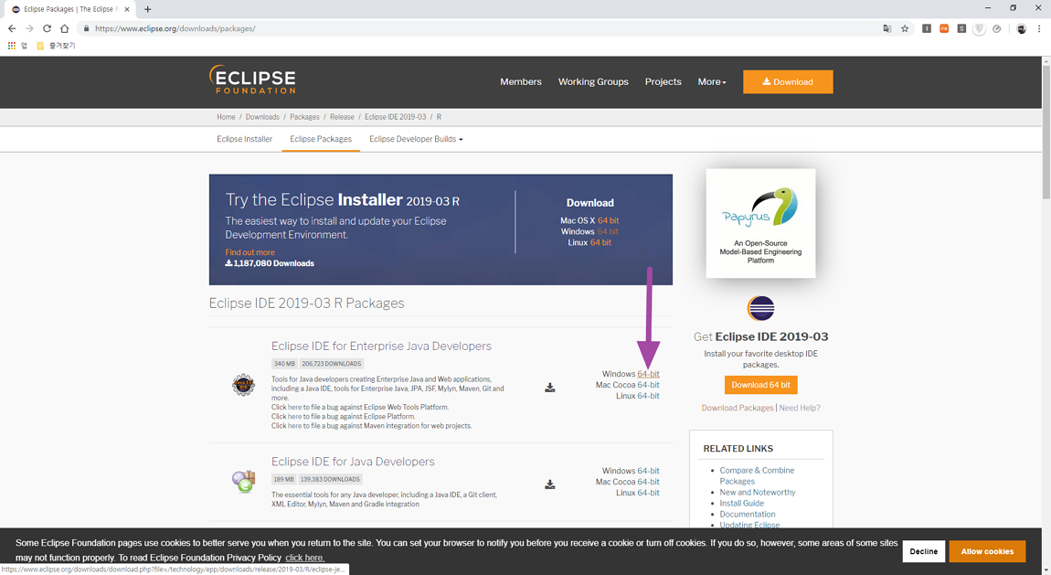 현재 다운로드받는 버전과 어떤 타입의 이클립스 버전인지 상세 내용을 확인하실 수 있습니다.