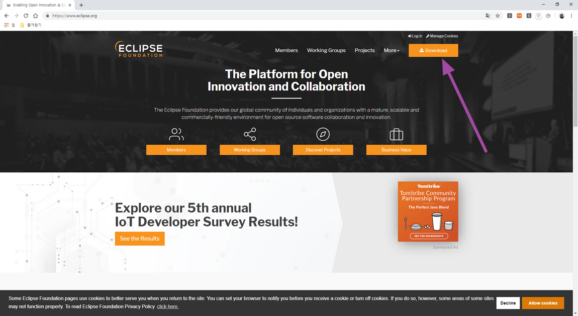 https://www.eclipse.org 이클립스 공식 사이트에서 다운로드 메뉴를 통해 이클립스를 다운받으실 수 있습니다.