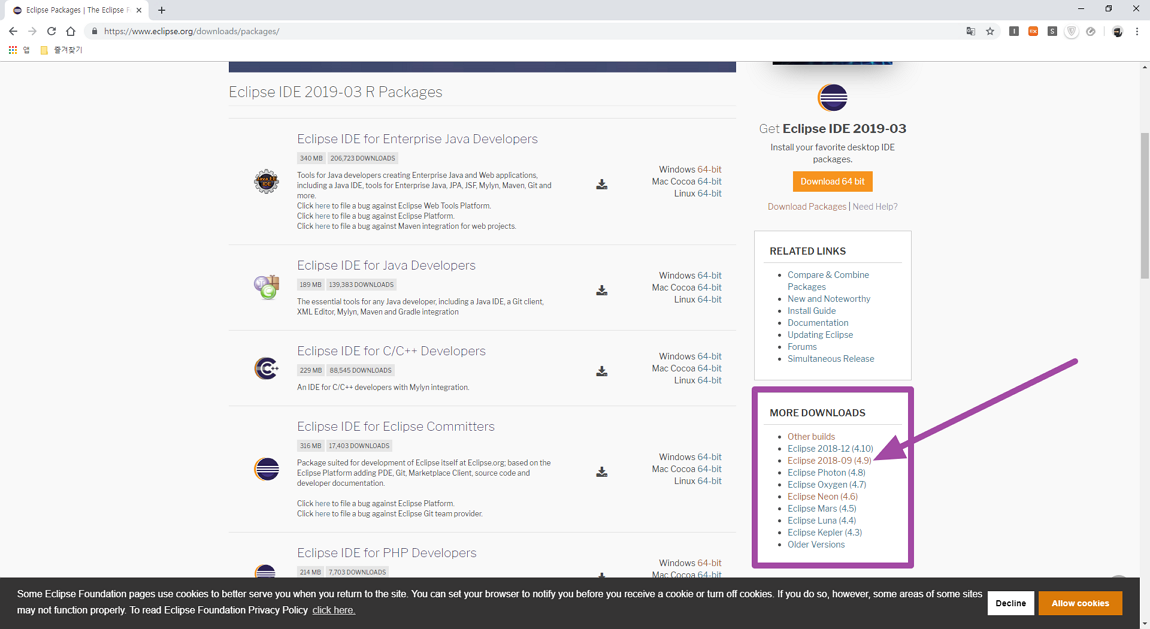 이클립스 사이트에서 원하시는 버전의 이클립스를 다운받으시려면 https://www.eclipse.org/downloads/packages/ 링크된 사이트에 접속하셔서 MORE DOWNLOADS 메뉴에서 원하시는 버전의 이클립스 버전의 메뉴를 선택하시면 해당 버전의 이클립스를 다운받으실 수 있습니다.