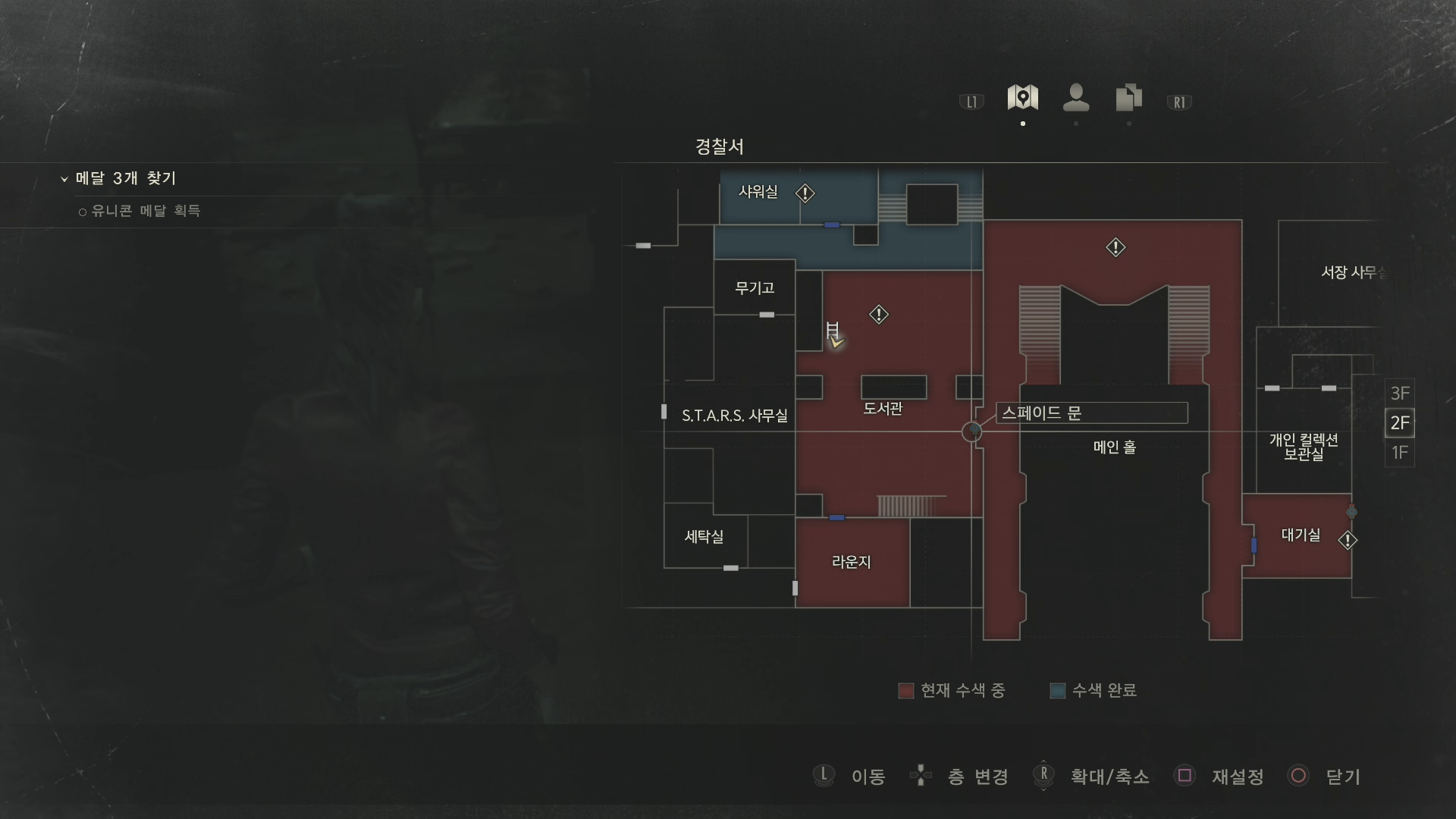 바이오하자드2의 맵 표시는 굉장히 깔끔히 잘 표시해 주어서 좋았습니다만 맵을 보는 화면은 깔끔한데 좀비에 압박과 다급함으로 인해 실제 플레이 화면에서는 길을 찾기 너무 어려워 맵을 수십번 보며 길을 많이 헤맸던 기억이 납니다.