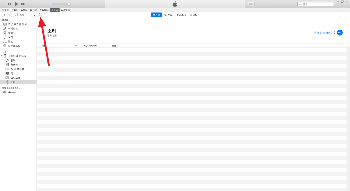 아이튠즈를 설치하시고 USB를 이용해 아이폰을 PC와 연결 하시고 연결이 정상적으로 아이폰과 연결이 완료되시면 아래 이미지와 같이 핸드폰 모양의 아이콘이 생깁니다. 핸드폰 모양의 아이콘을 눌러 주시면 됩니다.