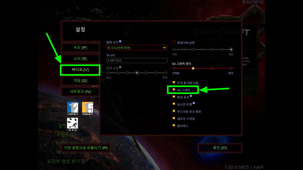 그러니 저와 비슷한 현상으로 스타크래프트 리마스터 그래픽으로 게임 화면이 나오지 않으시는 분들은 간단히 설정 메뉴에서 HD 그래픽이 켜져 있는지 확인해 보시면 좋을 것 같습니다.