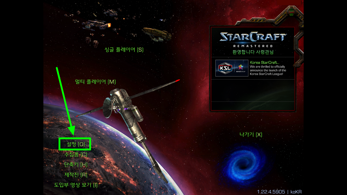 스타크래프 게임을 실행하고 배틀 넷 접속 하기 전에 설정 메뉴가 있습니다. 설정 메뉴를 눌러 주세요. 게임 내에서도 설정 변경이 가능 합니다. ESC > 설정