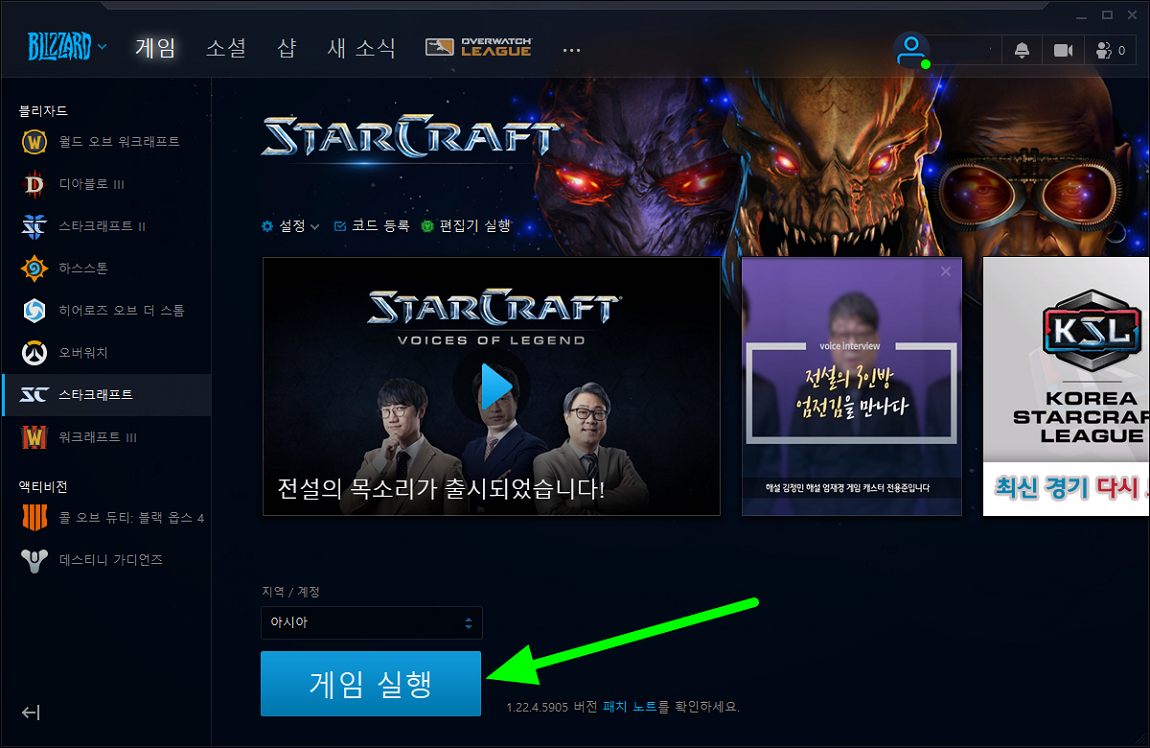 아래 이미지와 같이 스타크래프트 리마스터 구매한 블리자드 계정으로 다시 로그인하시고 스타크래프트를 실행하시면 됩니다.