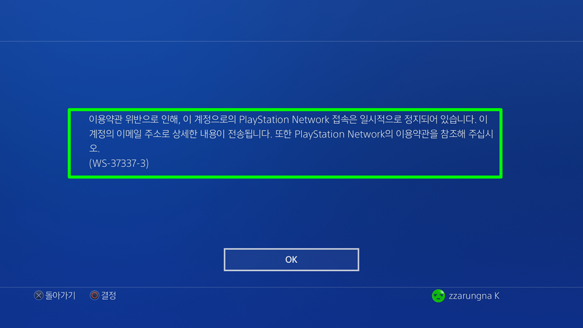 오랜만에 PSN에 다시 로그인하려고 보니 이용약관 위반으로 인해, 이 계정으로의 PlayStation Network 접속은 일시적으로 정지되어 있습니다. 이 계정의 이메일 주소로 상세한 내용이 전송됩니다. 또한 PlayStation Network의 이용약관을 참조해 주십시오. (WS-37337-3)