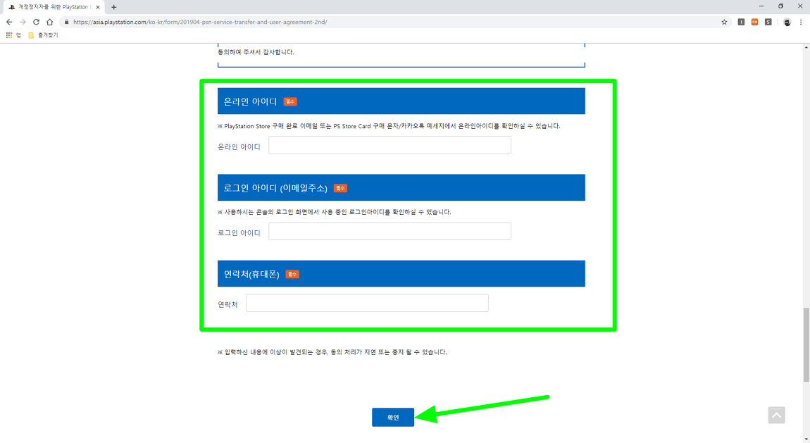 아래 이미지와 같이 온라인 아이디, PSN 로그인 아이디(이메일 주) 연락처를 모두 입력하시고 확인을 눌러 주시면 됩니다.