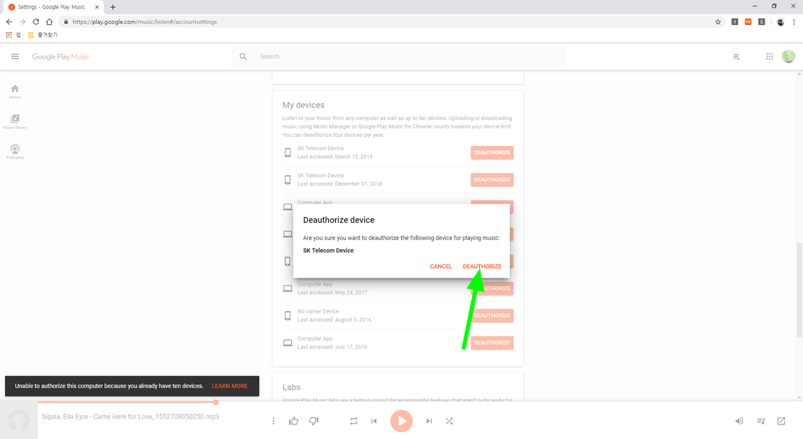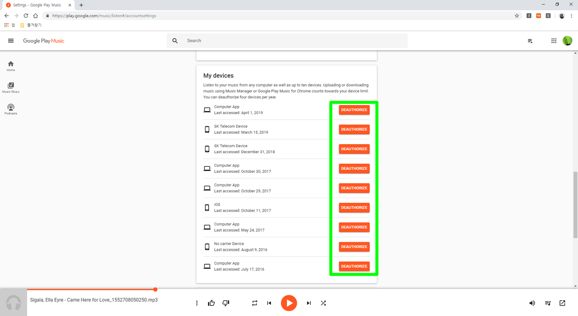 구글 뮤직(Unable authorize this computer because you already have ten devices) 설정 방법