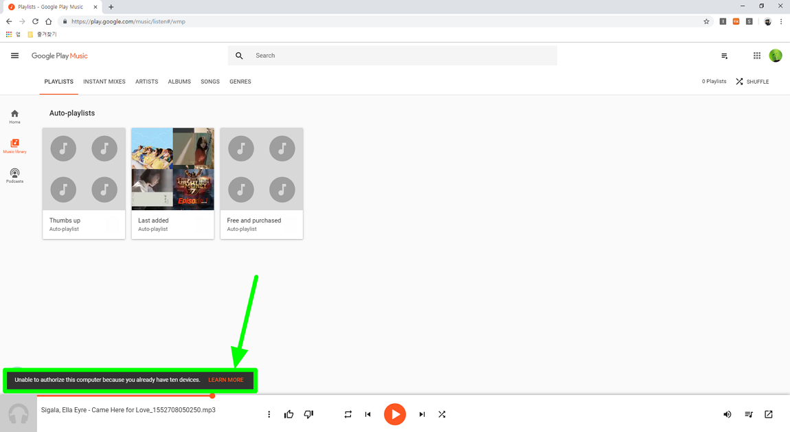 저는 여러 환경에서 테스트 하다 보니 구글 뮤직에서 인증 기기 목록이 10대가 이미 찼네요. 사용하지 않는 인증 기기를 몇 개 해제해 주시면 됩니다.