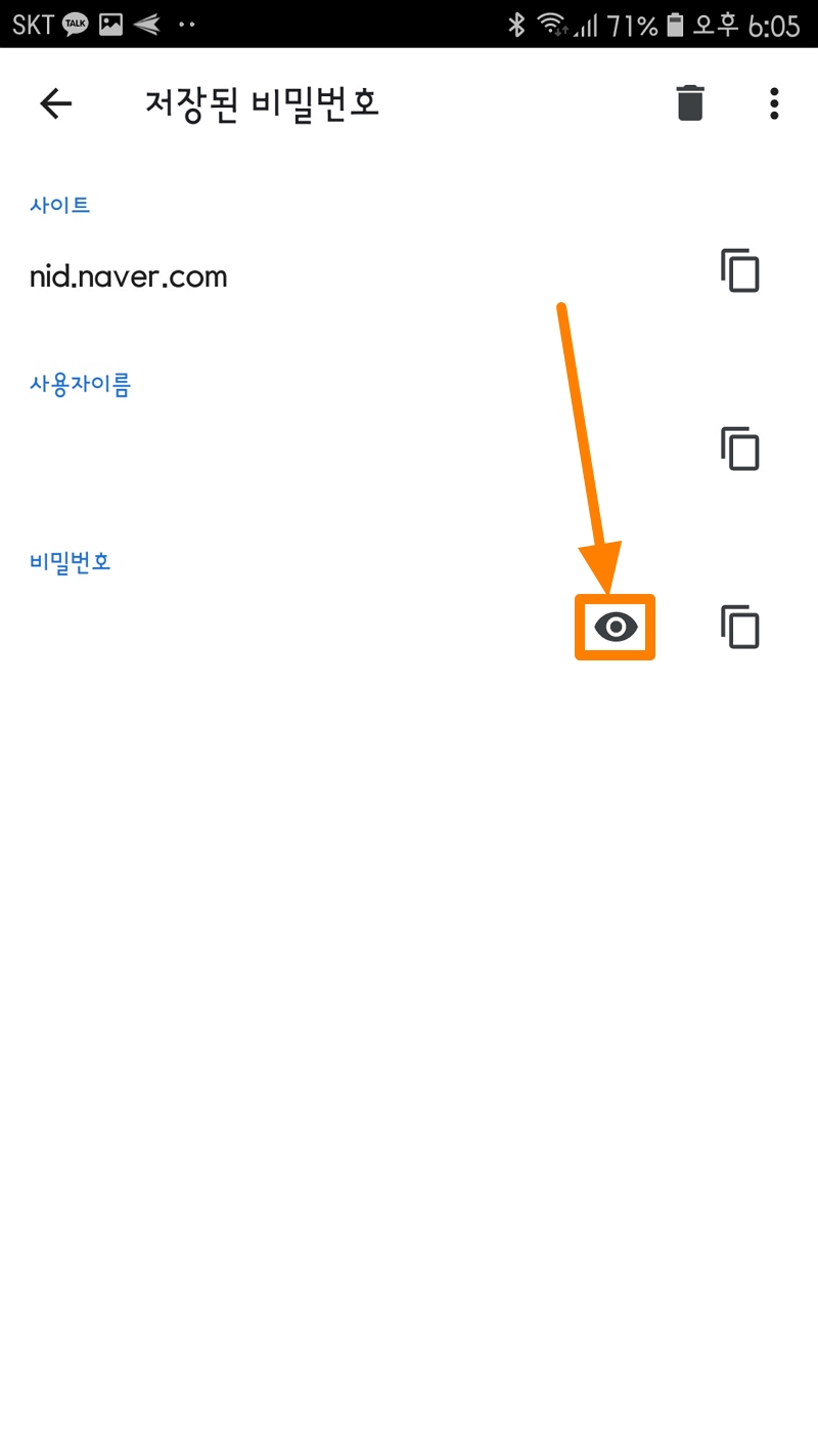 모바일 환경에서도 눈 모양의 아이콘을 누르시면 등록했었던 자동 로그인 사이트들의 비밀번호를 확인하실 수 있습니다.