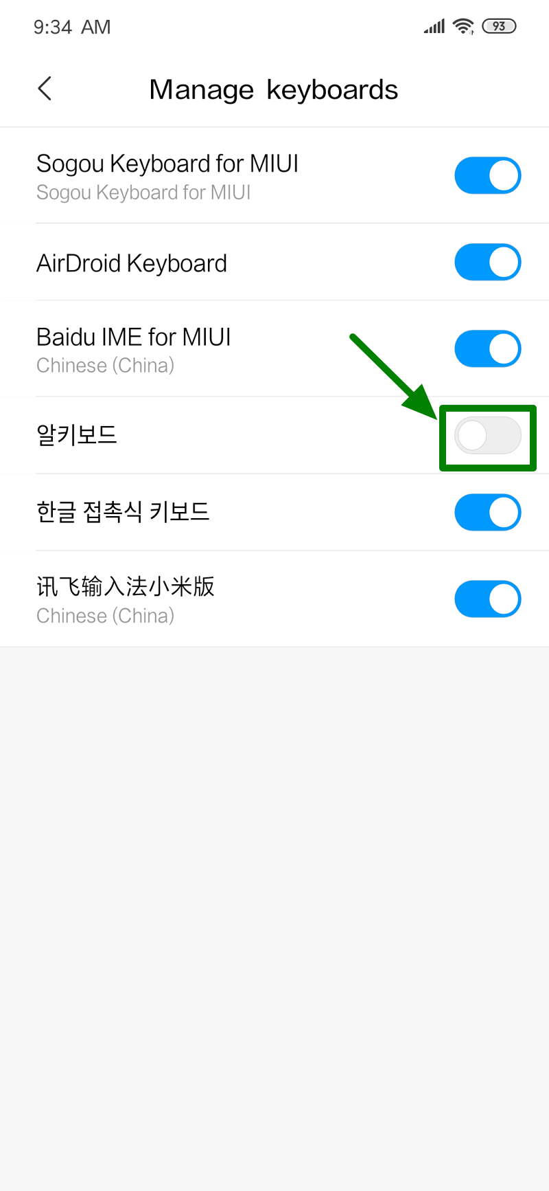 1. 설정 메뉴에서 설치한 앱의 한글 키보드 앱을 활성화해줍니다.