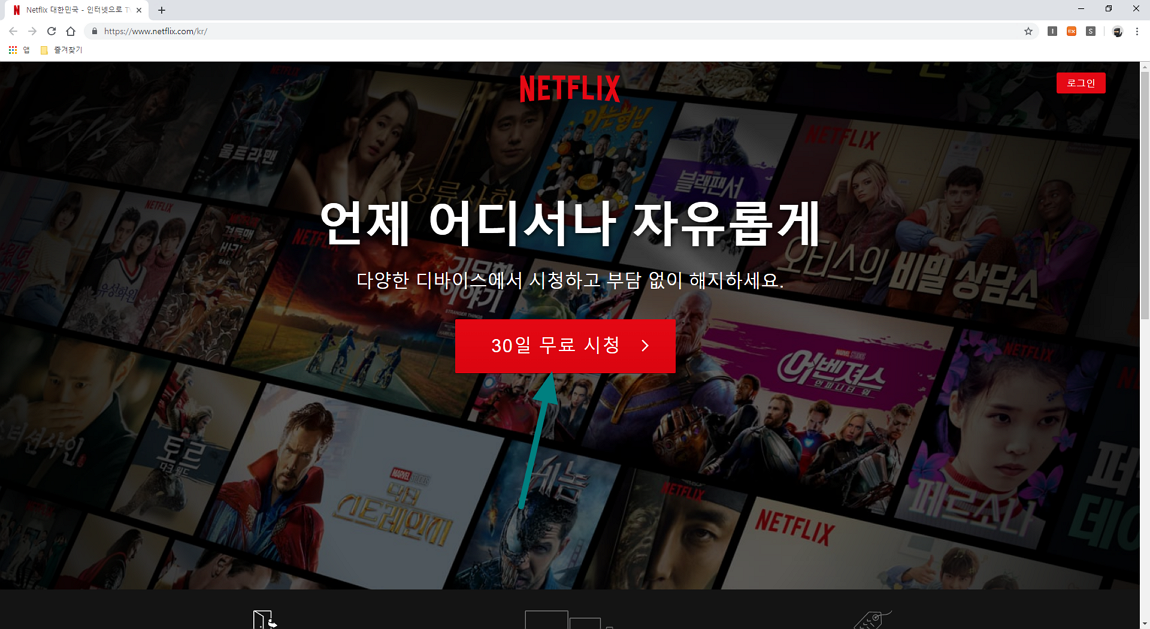 무료로 30일 이용 방법은 어렵지 않았습니다. https://www.netflix.com/kr/ 넷플릭스 사이트에 접속해 가입 절차를 진행하면 됩니다. 물론 신용카드 정보 등록을 하는 과정이 있긴 하지만 어렵지 않게 30일 동안 무료로 넷플릭스를 이용해 볼 수 있었습니다.