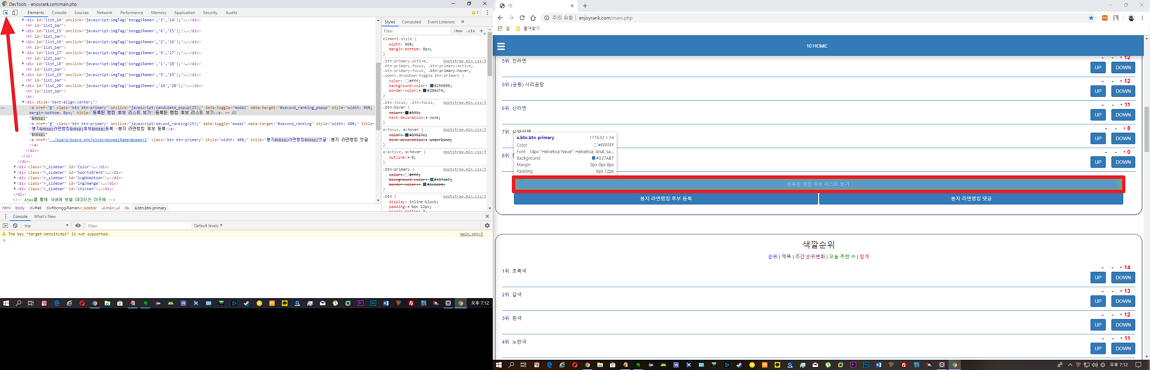 왼쪽 화면에 개발자 모드 페이지에서 빨간색 화살표 방향에 표시된 부분에 버튼을 눌러 주시고 오른쪽 웹페이지에서 수정하거나 변경하고자 하는 태그를 마우스로 선택해 주시면 됩니다.