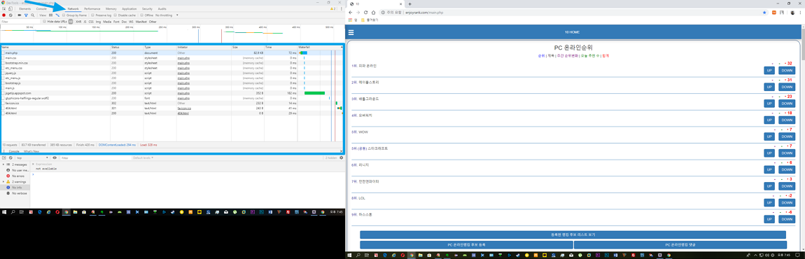 아래 이미지와 같이 왼쪽은 개발자 모드 오른쪽은 웹사이트가 표시됩니다.