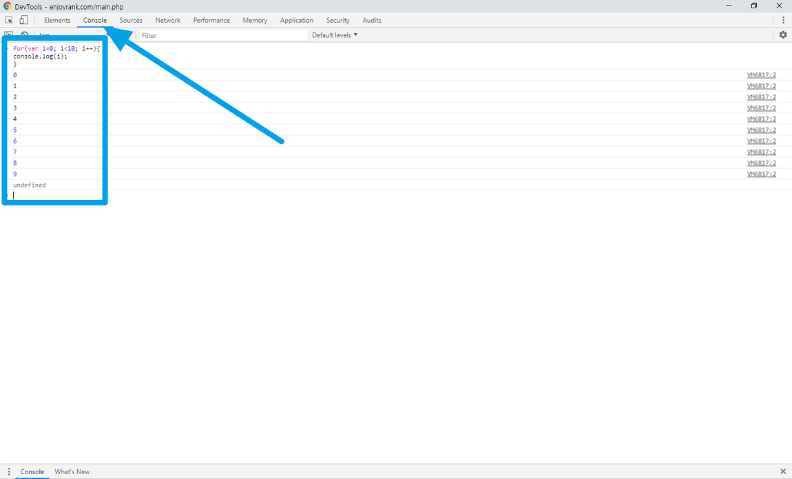 간단히 for 문을 돌리고 콘솔 로그로 찍어보니 잘 작동하는 것을 확인 할 수 있었습니다. 코드를 보기 편하게 하기 위해서 띄어쓰기나 다음 칸에 작성하고자 하시는 구문은 Shift+Enter를 눌러 주시고 코드를 작성하시면 한 줄에 다 작성하지 않으셔도 됩니다.