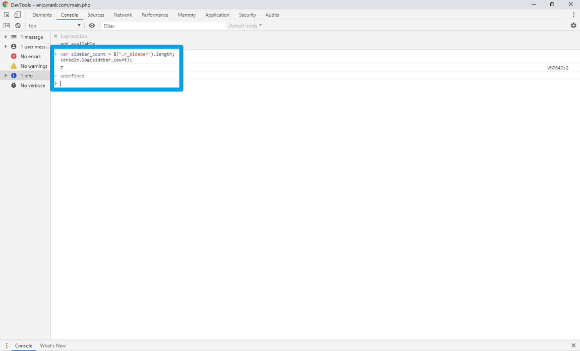아래 이미지와 같이 변수도 사용할 수 있고 jQuery도 사용 가능합니다. jQuery를 이용해 특정 태그를 찾고 로그를 찍어 보니 7이라고 표시가 됩니다.