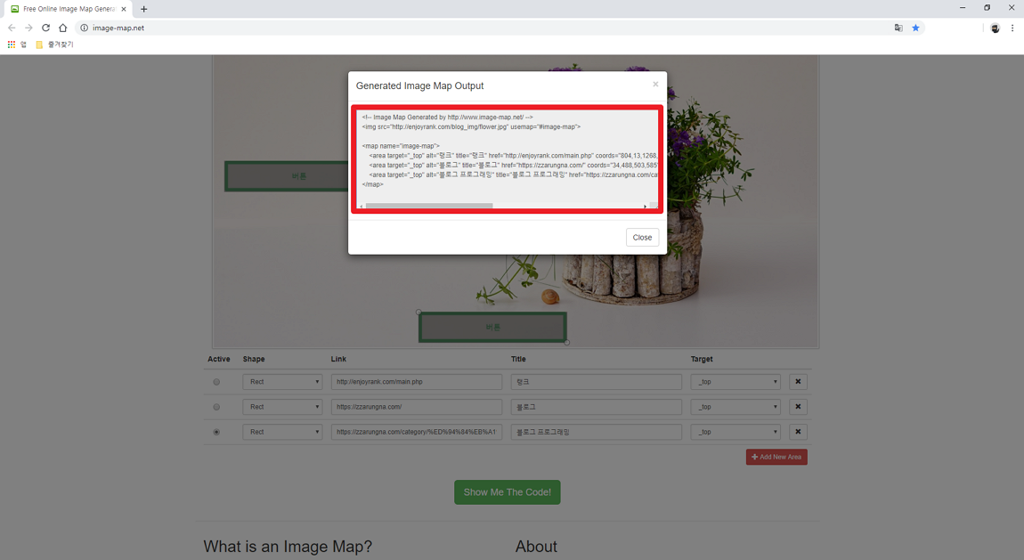 PC 버전은 위와 같이 특정 사이트를 이용해 생성된 코드를 적용하면 간단히 이미지에 원하는 영역에 링크를 연결할 수 있습니다.