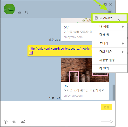 게시글 작성하기 기능을 통해 보이지 않았던 대화 내용을 컴퓨터 환경에서 확인하기 위해 상단 오른쪽 메뉴에 있는 메뉴 버튼을 누르고 톡 게시판에 누르면 방금 핸드폰 환경에 남아있던 글을 톡 게시판을 통해 확인하실 수 있습니다.