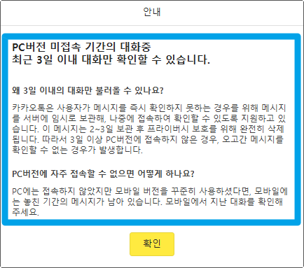 눌러보니 다행히 아래 이미지와 같이 안내 문구를 확인할 수 있었습니다. 안내문을 확인해 보니 카카오톡을 PC와 모바일 환경에서 사용하면서 3일 이내에 접속을 하지 않았을 때 데이터가 표시되지 않는다는 내용이었습니다.