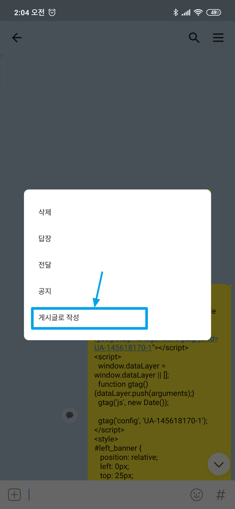 핸드폰에 있는 대화 내용과 데이터를 컴퓨터 환경에서 다운받기 위해 기존에 작성했던 글을 손으로 터치하고 계시면 게시글로 작성 기능을 통해 유실되었던 데이터 기록을 남길 수 있습니다. 게시글로 작성을 누르면 새 창이 뜨는데 확인만 누르면 기존에 이미지 및 파일과 대화 내용이 한 번에 게시글로 이동되어 편합니다.