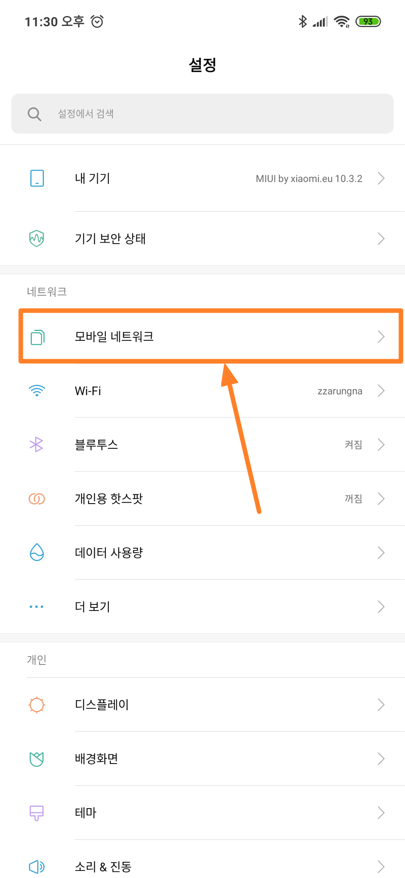 설정 메뉴에서 모바일 네트워크 메뉴 선택.