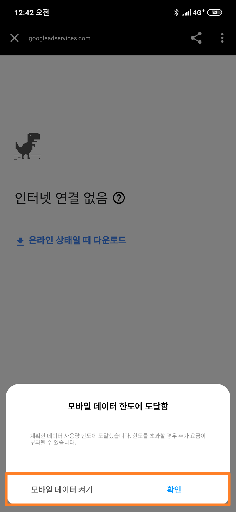 다시 사용하려면 아래 이미지와 같이 모바일 데이터 켜기를 선택해 주셔야 합니다.