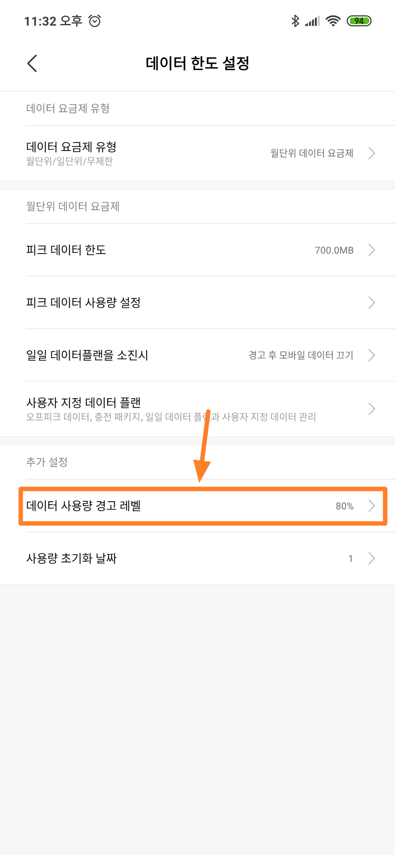 데이터 제한 설정은 끝났습니다만 마지막으로 데이터 사용량 경고 레벨만 설정해 주도록 합시다. 저는 80%로 설정했습니다. 아무래도 데이터를 다 사용하기 전에 어는 정도 데이터가 남았는지 파악하면 좋을 것 같습니다.