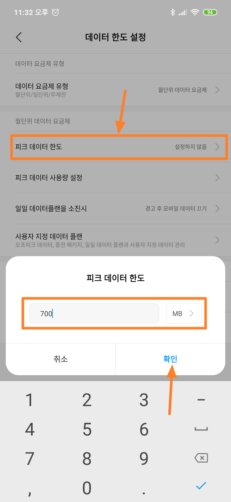 가장 중요한 부분 피크 데이터 한도 메뉴를 선택하시고 한 달에 사용하시는 데이터 사용량에 맞는 데이터를 넣어 주시면 됩니다.