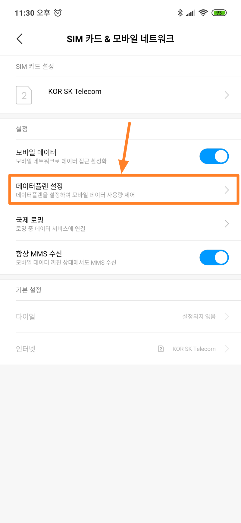 네트워크 메뉴에서 데이터플랜 설정 메뉴 선택.