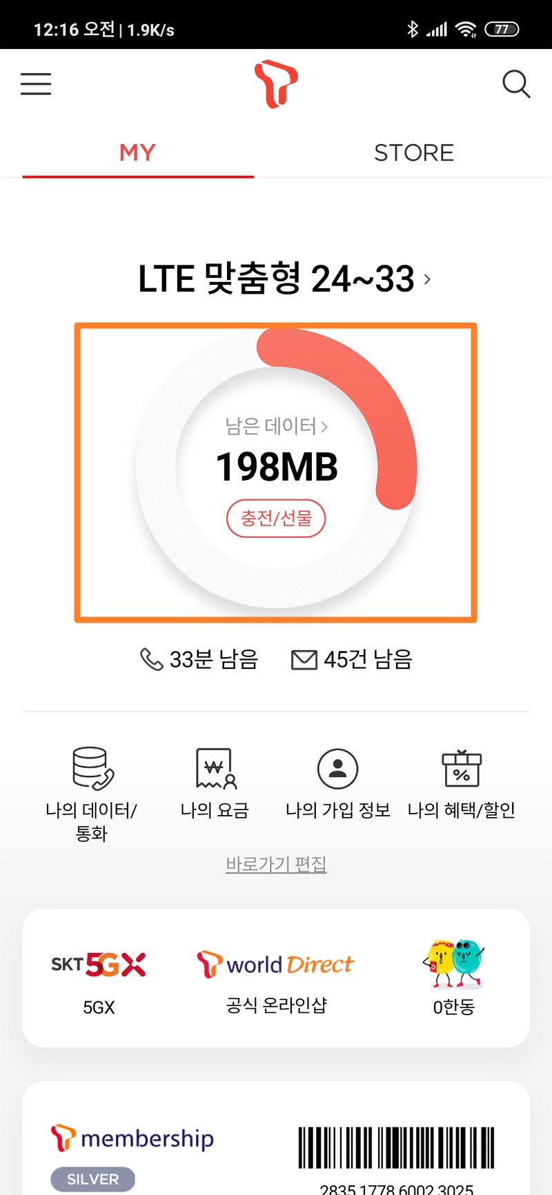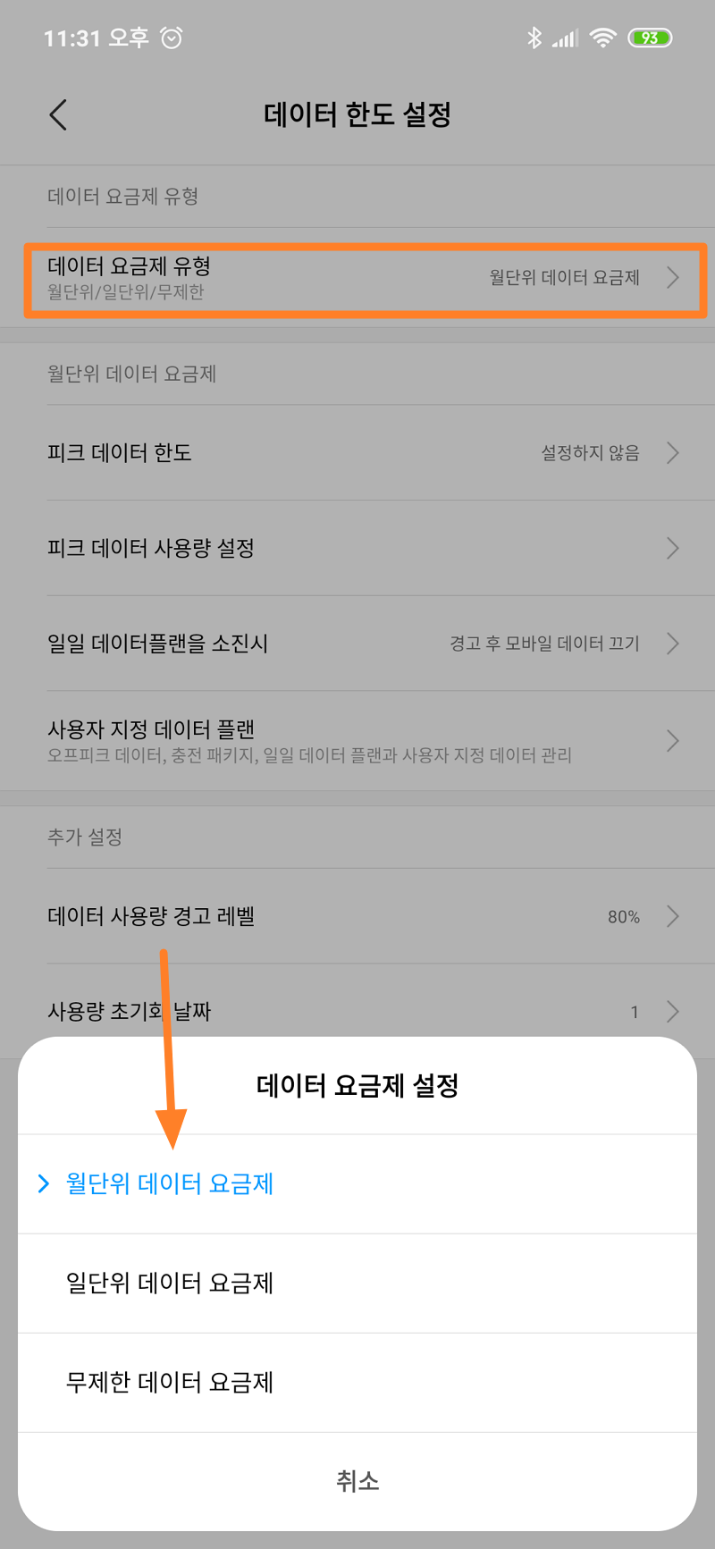 대부분 월 단위 요금제를 사용하실 테니 데이터 요금제 유형이 월단위 데이터로 되어 있는지만 확인하시면 됩니다. 기본으로 월 단위로 되어 있습니다.