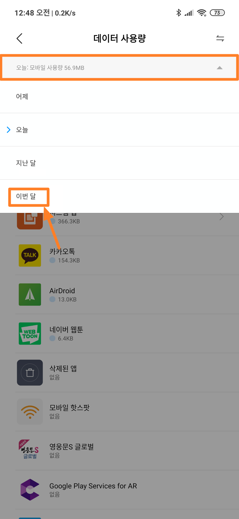 데이터 사용량을 월 단위로 확인하고 싶으시다면 데이터 사용량이 표시되는 메뉴를 누르시면 아래 이미지와 같이 여러 메뉴가 나오게 됩니다. 여기서 이번 달을 선택하시면 월 단위 통계로 사용한 데이터를 확인하실 수 있습니다.