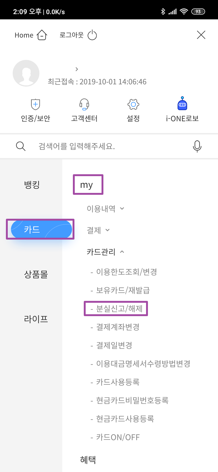 왼쪽 메뉴에서 카드 메뉴, MY 메뉴, 분실신고/해제 메뉴를 선택하시면 됩니다.
