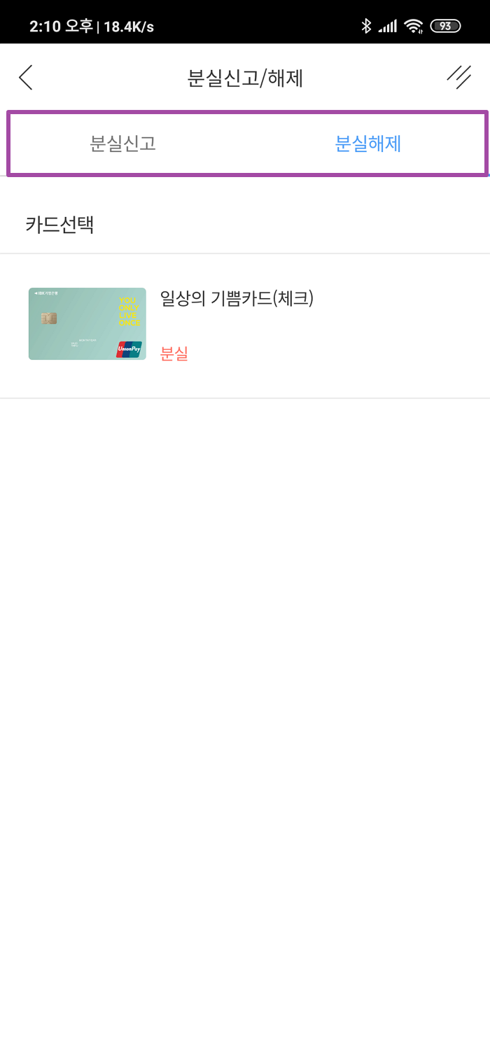 아래 이미지와 같이 앱을 통해서 기업은행에서 사용하는 신용카드/체크카드를 분실신고를 진행하실 수 있고 분실해제를 할 수 있습니다.