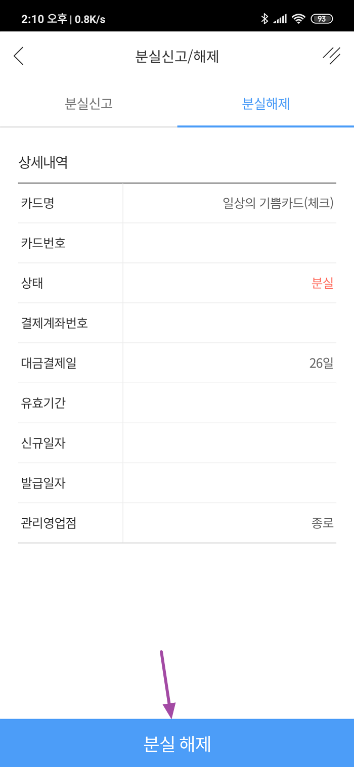 저는 고객센터 ARS를 통해 분실신고를 하였고 분실해제는 아래 이미지와 같이 앱을 통해 진행하였습니다. 카드 정보가 나오는데 분실 해제 버튼을 눌러 주시면 됩니다.