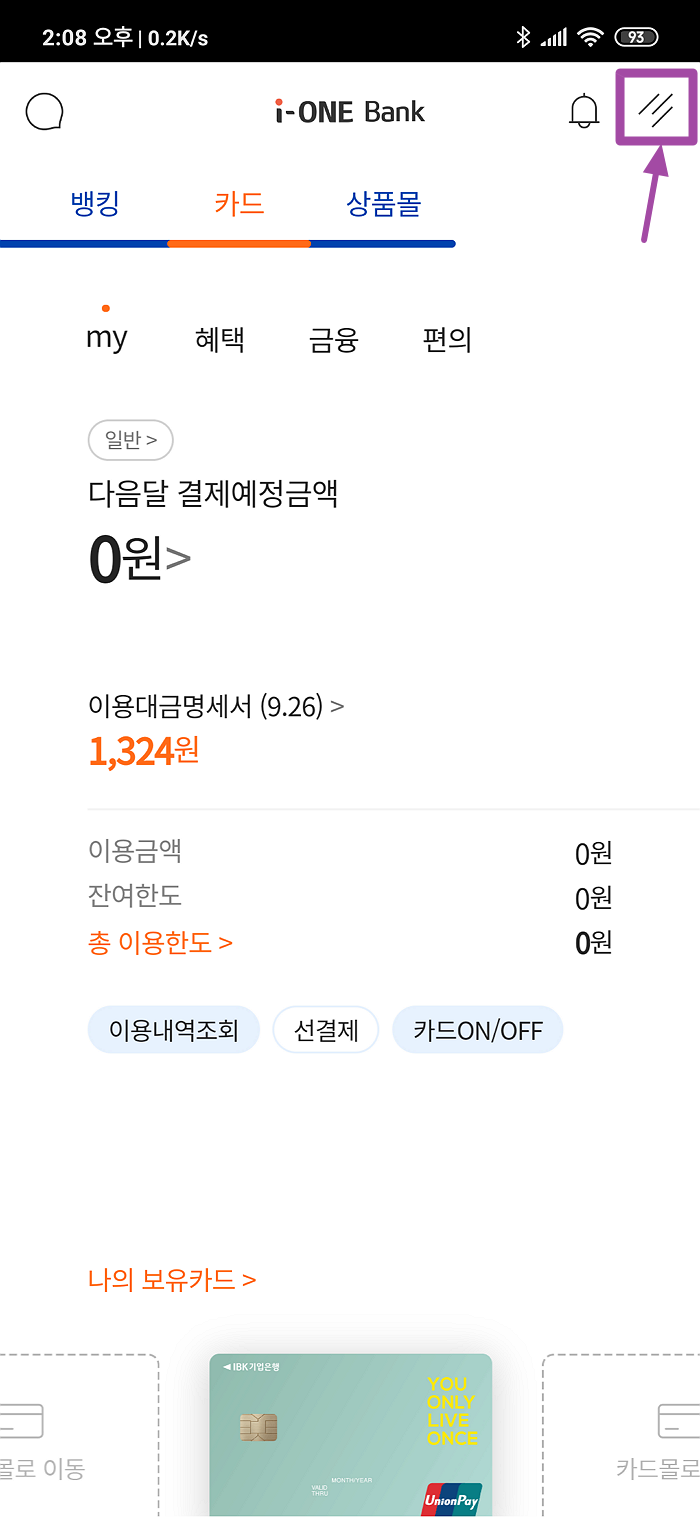 다행히 저는 PC에 기존에 사용하던 공인인증서가 있어 핸드폰으로 인증서를 옮겨 로그인을 할 수 있었습니다. 앱을 설치 후 인증서 로그인을 하시면 아래 이미지와 같이 기업은행에서 사용하는 카드 리스트를 확인하실 수 있습니다.