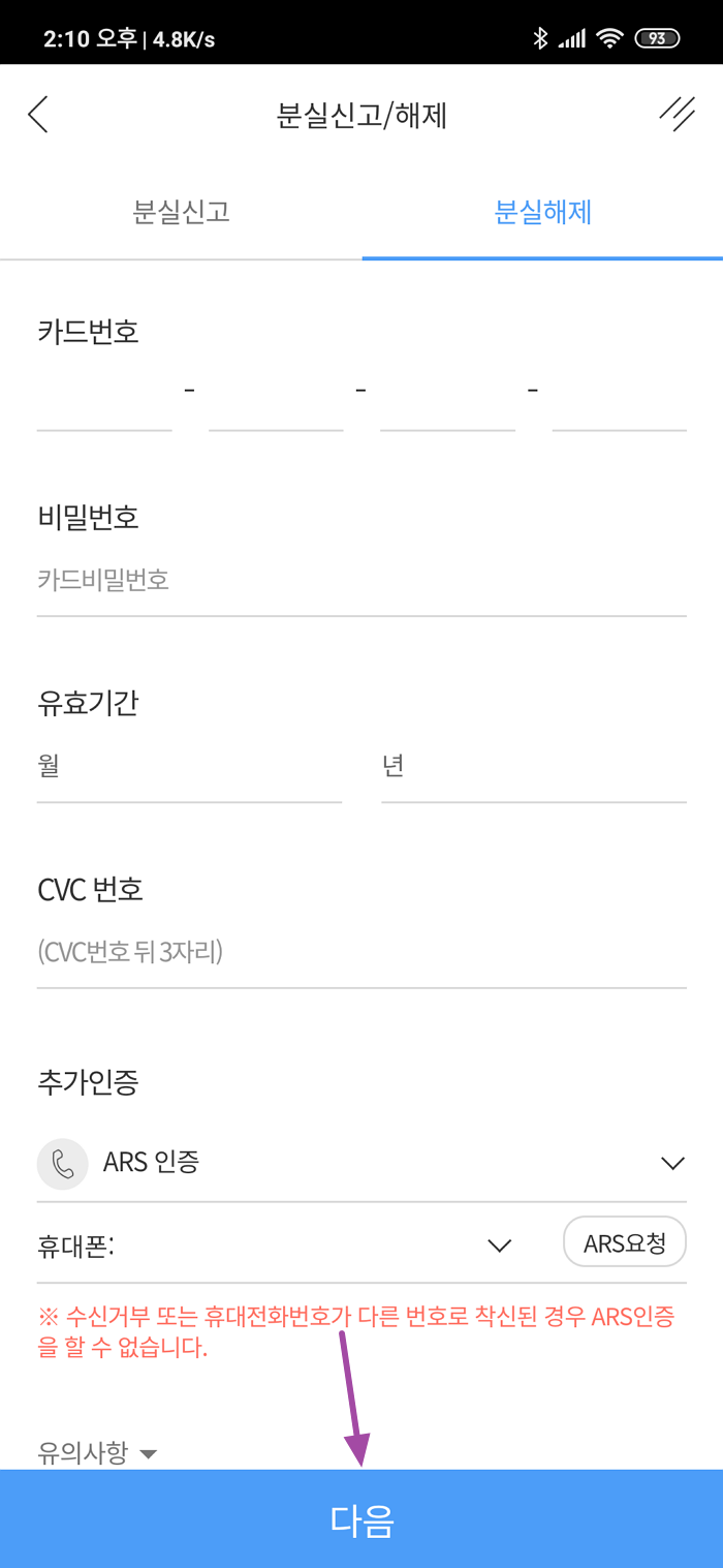 그럼 카드 번호와 카드 비밀번호 유효기간 CVC 번호 ARS 인증 까지 모두 입력하시고 진행하셔야 됩니다. 저는 다행히 지갑을 찾아서 카드 정보를 모두 입력하고 ARS 인증까지 완료한 뒤 정지된 카드를 해제할 수 있었습니다.