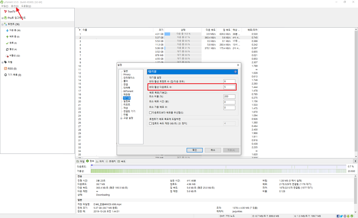 기본적으로 토렌트 프로그램은 최대 5개의 파일만 다운로드받을 수 있도록 설정되어 있는데 옵션 -> 설정 -> 대기열 메뉴를 선택하시면 토렌트 프로그램에서 최대 활성 다운로드 수를 조정하실 수 있습니다.