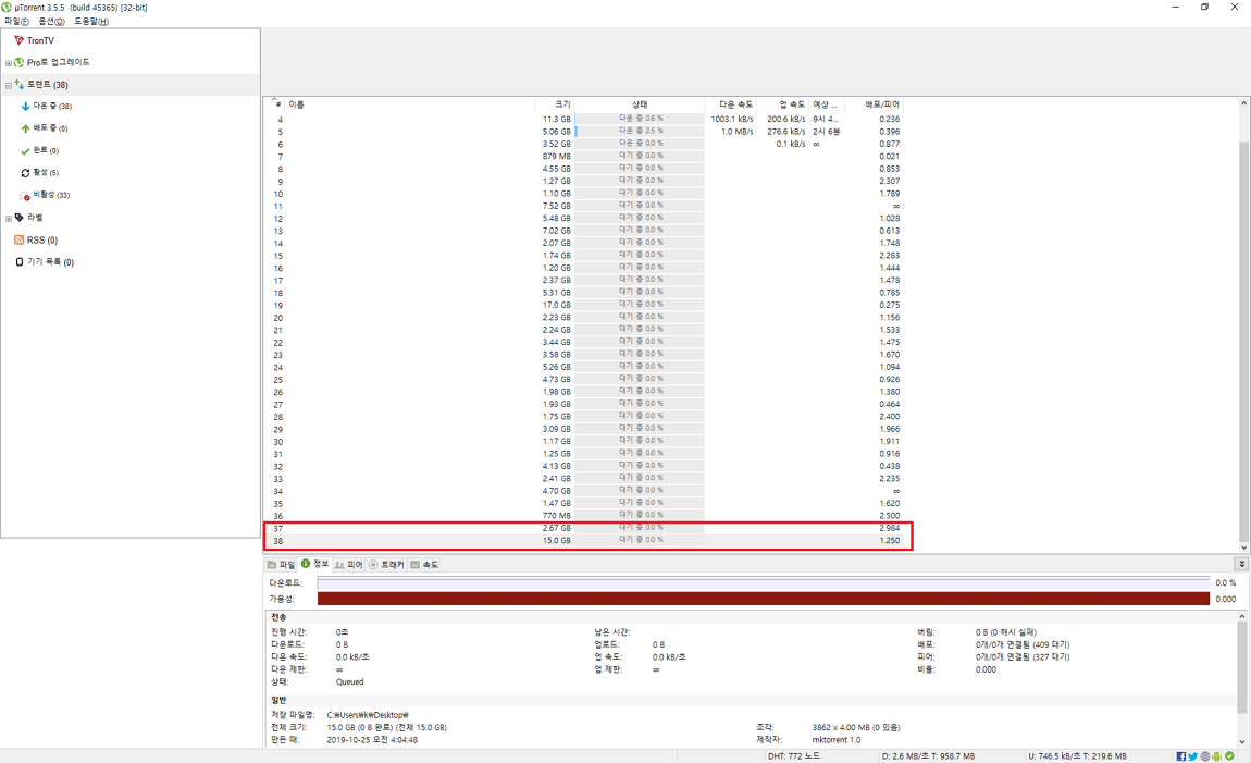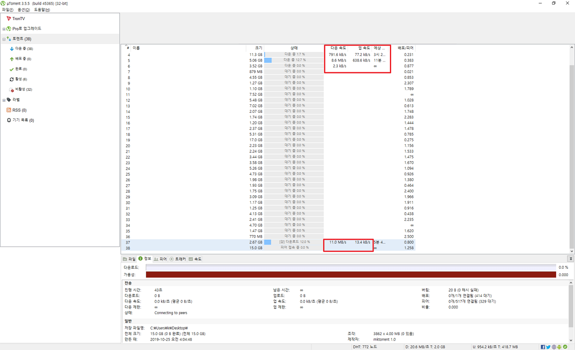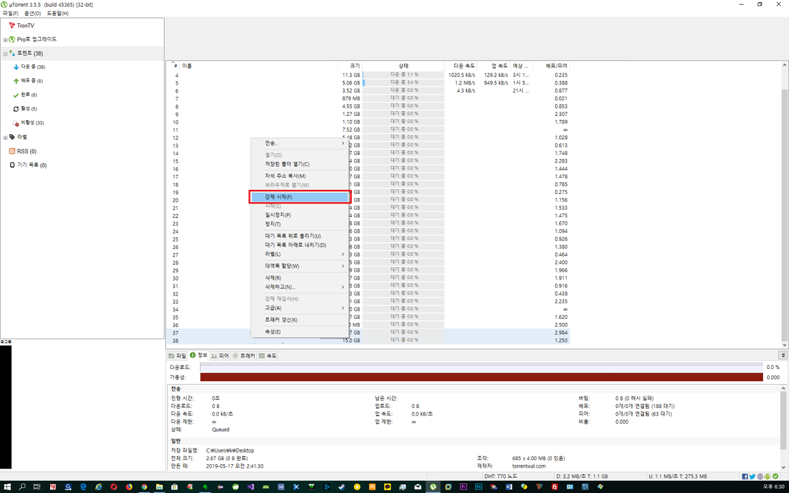 강제 시작을 이용해 다운로드를 진행하는 경우 토렌트 특성상 많은 사람이 받는 파일이라면 빠르게 강제 시작한 것들이 다운로드되고 다시 이전에 다운로드 목록에 있는 것들이 자동으로 다운로드가 진행됩니다.