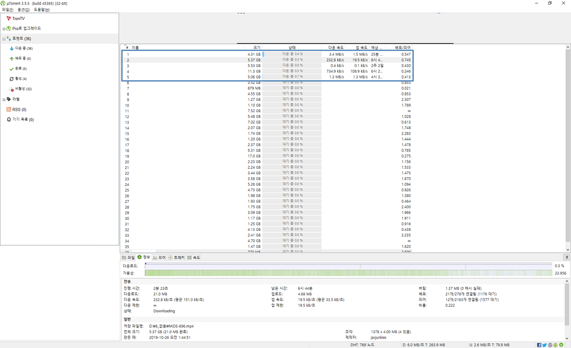 먼저 아래 이미지와 같이 토렌트 프로그램을 이용해 다운로드받는 파일 목록이 많이 있습니다. 현재 토렌트 프로그램 내에서는 5개의 파일이 활성화되어 다운로드받아지고 있네요.