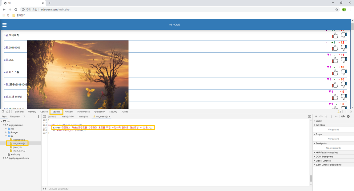 Sources 메뉴에서 코드를 작성하고 Ctrl+S를 눌러 저장해 주시면 됩니다. 아래 이미지와 같이 크롬 브라우저에서 적용한 소스 코드 내용이 바로 적용된다는 걸 보여 드리기 위해서 추가로 이미지를 하나 첨부했습니다.