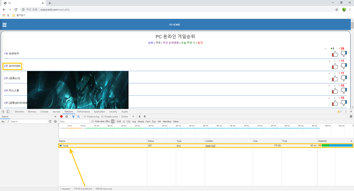 웹페이지 상 네트워크 전송을 통해 어떠한 것들이 이루어지는지 확인해 보기 위해 웹 페이지에 특정 버튼을 눌러 보니 아래 이미지와 같이 네트워크 메뉴에 실시간으로 그림 파일 하나를 가져온다는 것을 확인할 수 있습니다.
