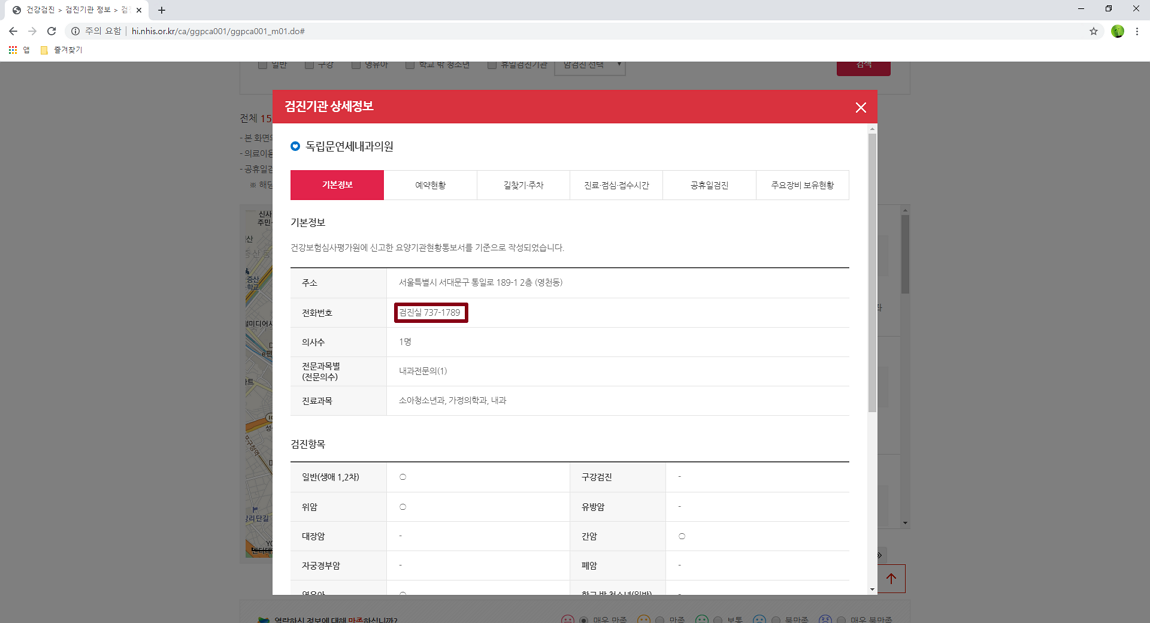 검색된 결과에 해당 병원을 선택하시면 검진 기관에 상세정보가 나오는데 검진 기관 대상이 되는 것을 확인했으니 이제 해당 병원에 전화해서 추가적인 정보를 물어보시면 될 것 같습니다.