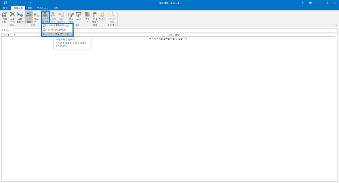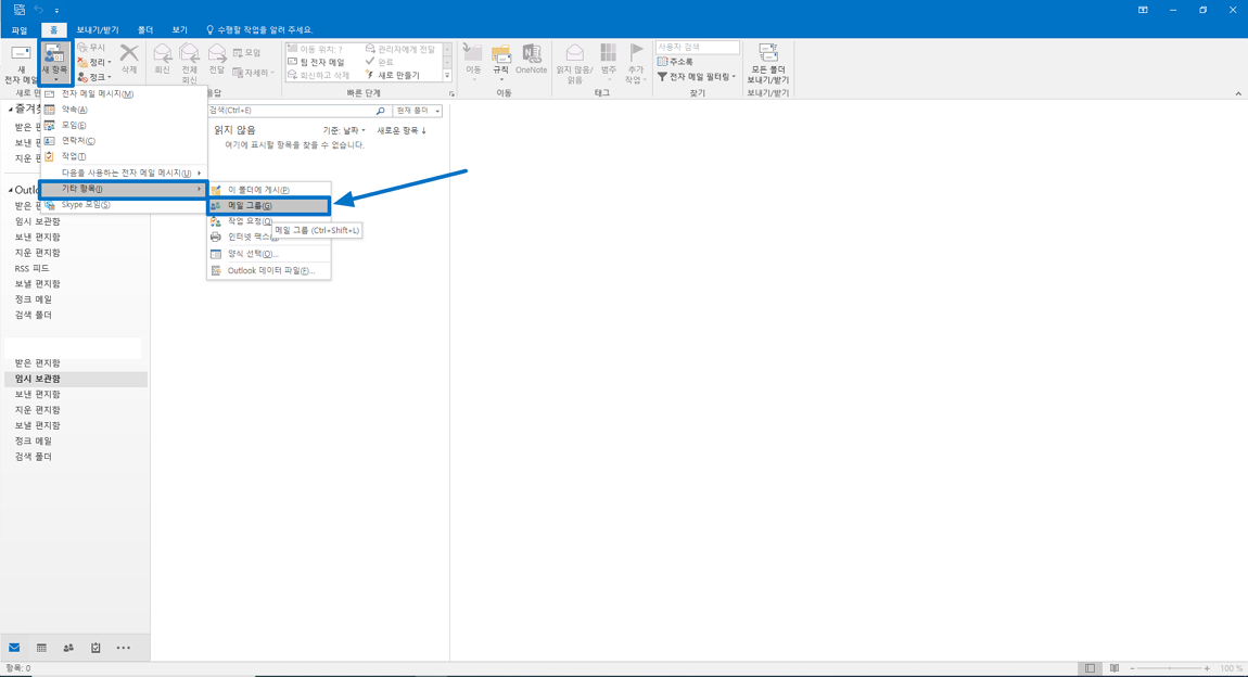 사용 방법은 먼저 아웃룩 홈 메뉴에서 아래 이미지와 같이 새 항목 메뉴 → 기타 항목 → 메일 그룹 메뉴를 선택하시면 됩니다.