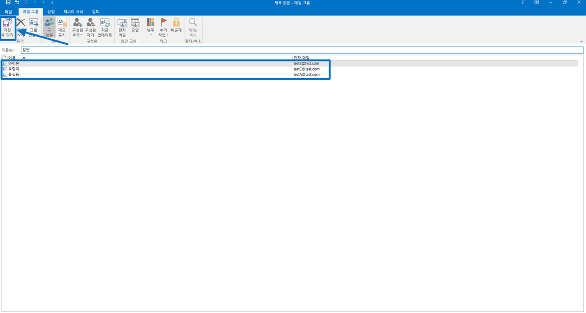 그룹 이름은 일번으로 작성하였으며 3개의 메일 주소를 추가 한 뒤 저장 후 닫기 버튼을 눌러 주시면 됩니다.