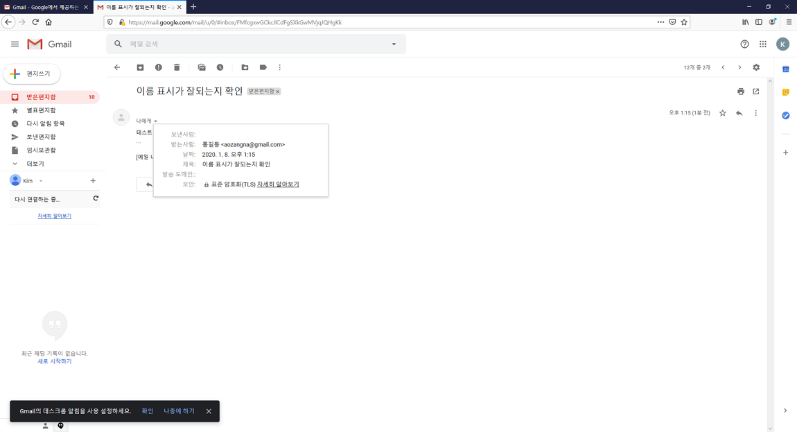 아웃룩 테스트를 통해 보낸 이메일은 아래 이미지와 같이 지메일에서 정상적으로 메일이 발송된 것을 확인할 수 있었습니다.