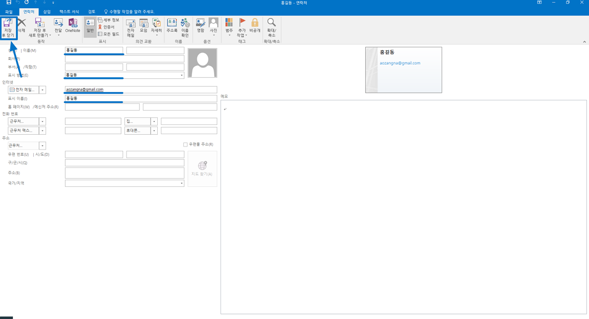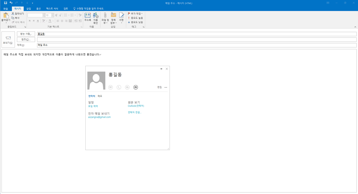 이제 아웃룩을 통해 메일을 보낼 때 아래 이미지와 같이 받는 사람 항목에 홍길동이라는 이름으로 자동으로 검색도 되고 표시됩니다.